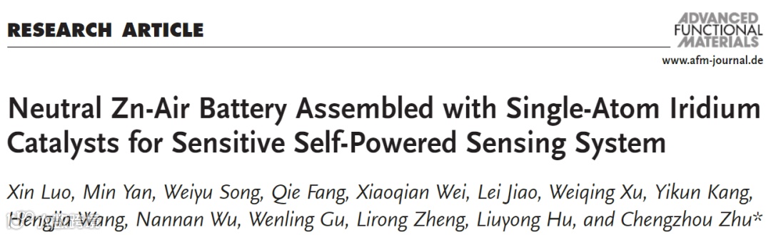 近日,来自华中师范大学的朱成周教授在国际知名期刊Advance Functional Material上发表题为“Neutral Zn-Air Battery Assembled with Single-Atom Iridium Catalysts for Sensitive Self-Powered Sensing System”的文章。