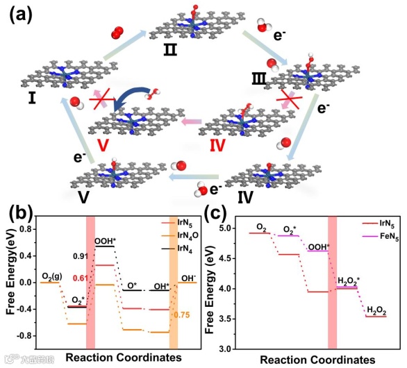 图4(a)IrN5模型上的 ORR 反应过程。(b)U = 1.23 V 时,IrN5、IrN4O和IrN4上ORR过程的能量图。(c)U = 0 V时,H2O2在IrN5和FeN5上的两电子氧化还原途径过程。