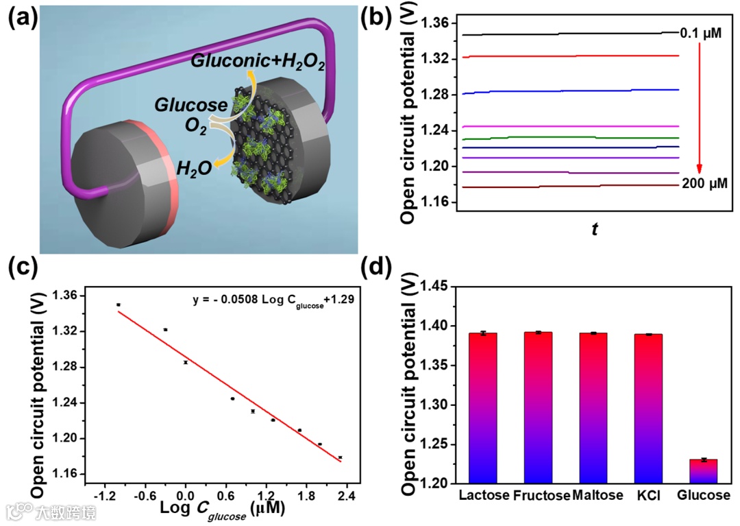 图6(a)自供能传感器的示意图。(b)加入葡萄糖后的OPC图及(c)相应线性曲线(d)添加乳糖、果糖、麦芽糖、KCl和葡萄糖后,OPC的响应图。