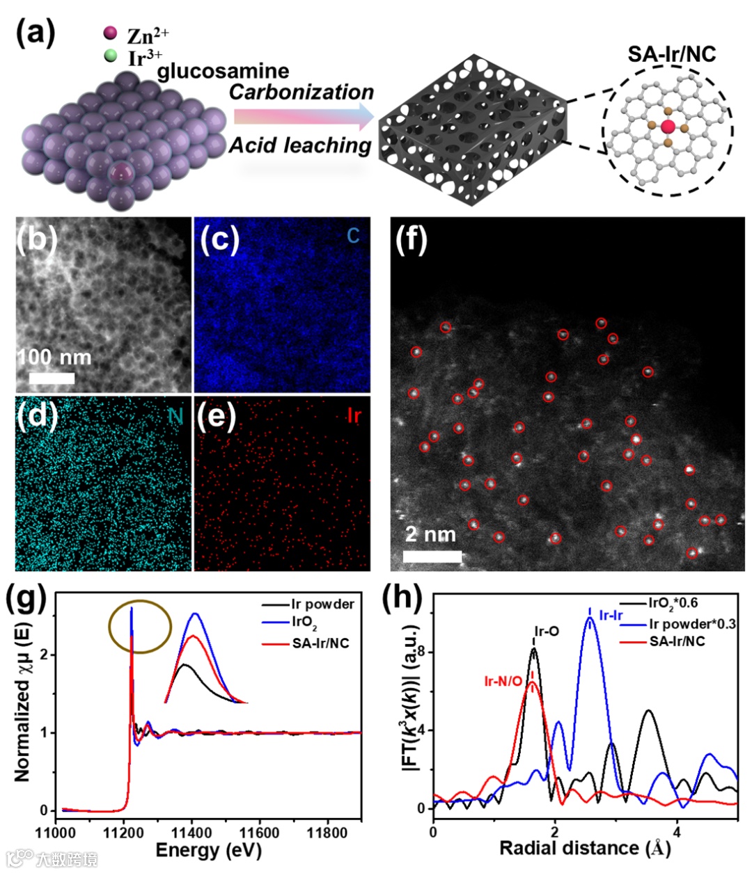 图2.(a)SA-Ir/NC的合成示意图。(b-e)HAADF-STEM和相应的元素映射图像及(f)AC-STEM图像。(g)SA-Ir/NC,Ir粉和IrO2的Ir L-边XANES谱图及(h)傅里叶转换EXAFS谱图。