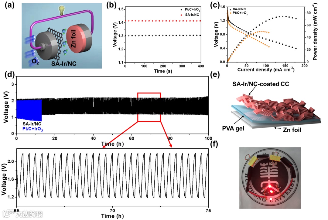 由于SA-Ir/NC有如此优异的活性和稳定性,将其组装成液态ZABs。图5b显示 ZABs器件的初始OCP为1.42 V,高于商业Pt/C+IrO2基ZABs(1.30 V)。