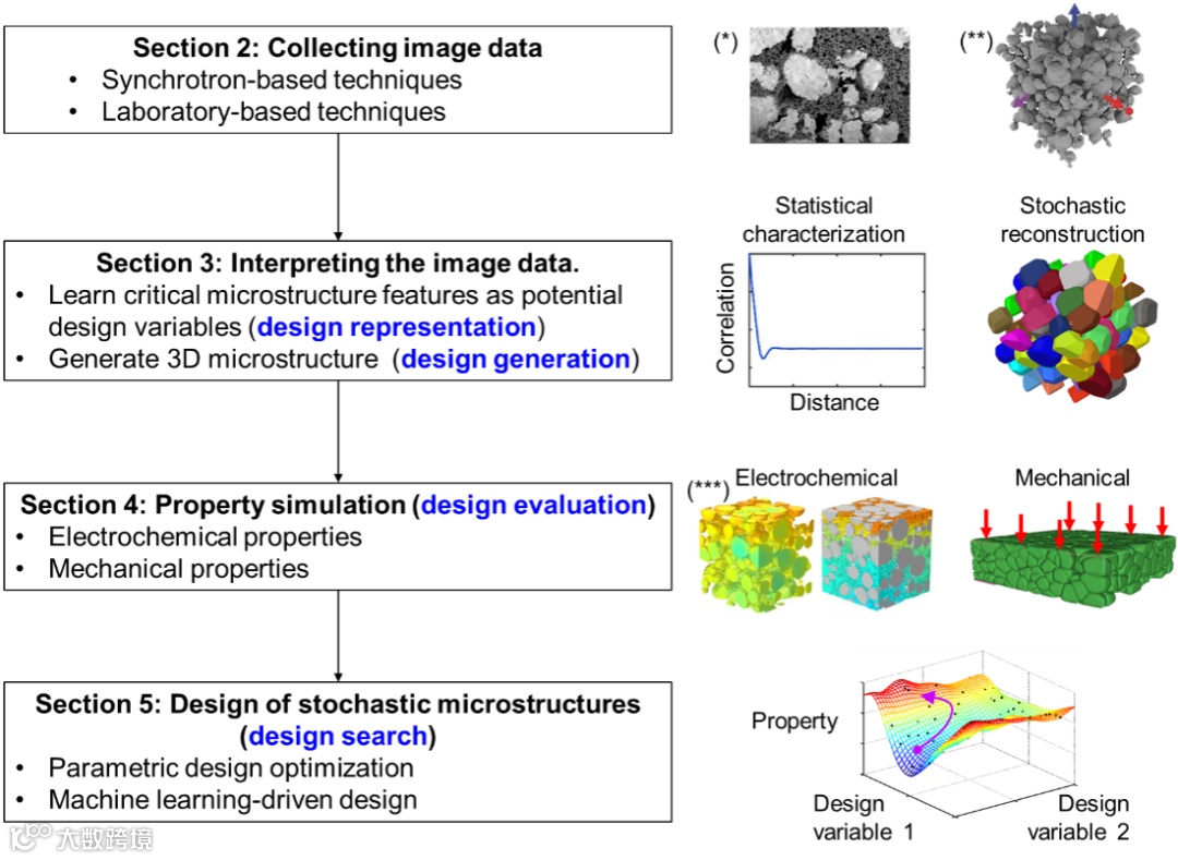 图1. 锂离子电池电极材料微观结构设计流程:图像数据采集,微观结构关键特征识别与数字化重构,材料性能预测,以及计算设计优化。