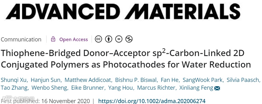 冯新亮教授Advanced Materials:噻吩桥联供体-受体SP2-碳连接的2D共轭聚合物作为水还原光电阴极 科学材料站