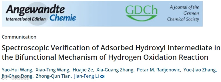 近日,厦门大学李剑锋教授在国际知名期刊Angewandte Chemie International Edition上发表题为“Spectroscopic Verification of Adsorbed Hydroxyl Intermediate in the Bifunctional Mechanism of Hydrogen Oxidation Reaction”的研究工作。