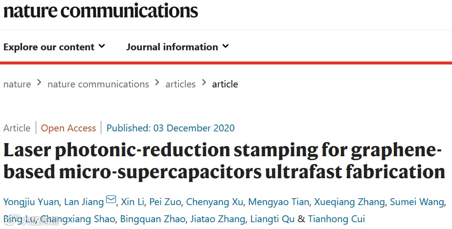 近日,北京理工大学姜澜教授等合作在国际期刊nature communications上发表题为“Laser photonic-reduction stamping for graphene-based micro-supercapacitors ultrafast fabrication”的研究工作。