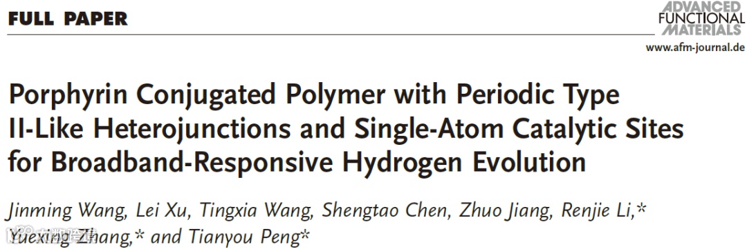 近日,武汉大学彭天右教授课题组Advanced Functional Materials (DOI: 10.1002/adfm.202009819)上发表题为“Porphyrin Conjugated Polymer with Periodic Type II‐Like Heterojunctions and Single‐Atom Catalytic Sites for Broadband‐Responsive Hydrogen Evolution”的观点文章。