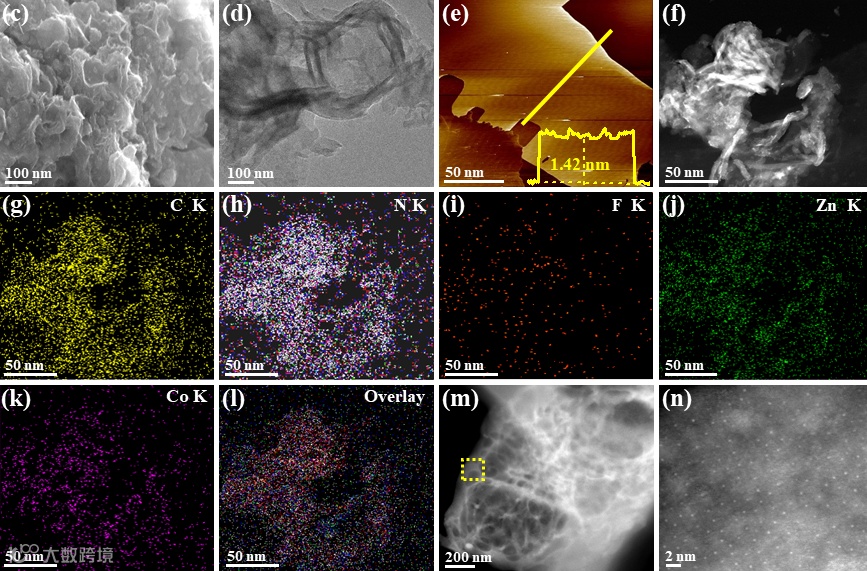 通过Sonogashira偶联反应,将锌卟啉单体(ZnP-Br)与钴卟啉单体(CoP、CoP-F)进行桥连,合成超薄的异金属卟啉基共轭聚合物(ZnCoP-F CP和ZnCoP CP)。理论计算结果表明,该共轭聚合物具有AA堆积结构。球差电镜结果显示卟啉环中心金属(Zn、Co)以单原子形式均匀分布在聚合物纳米片上。