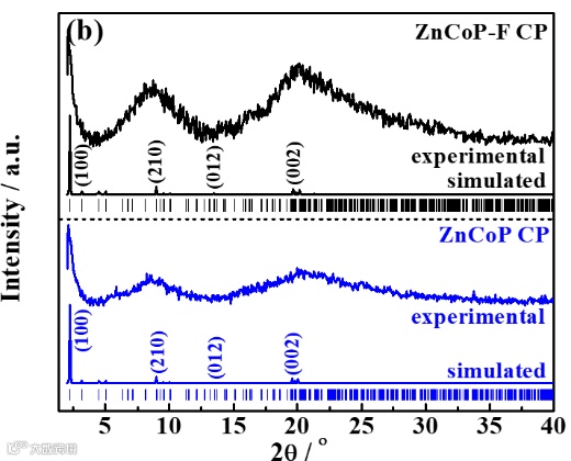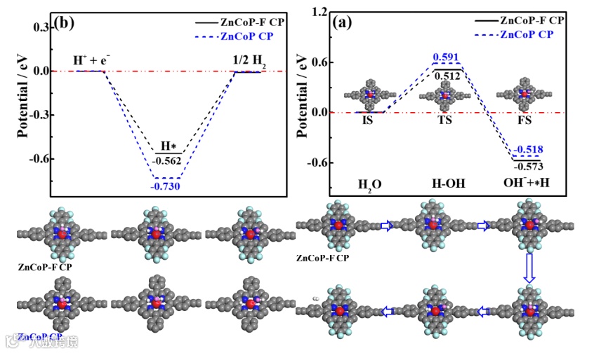此外,ZnCoP-F CP比ZnCoP CP有更低的析氢吉布斯自由能。这些结果表明含五氟苯取代基的ZnCoP-F CP比含苯基取代基ZnCoP CP更高的水分子吸附和氢释放能力,因而ZnCoP-F CP表现出更好的产氢活性。