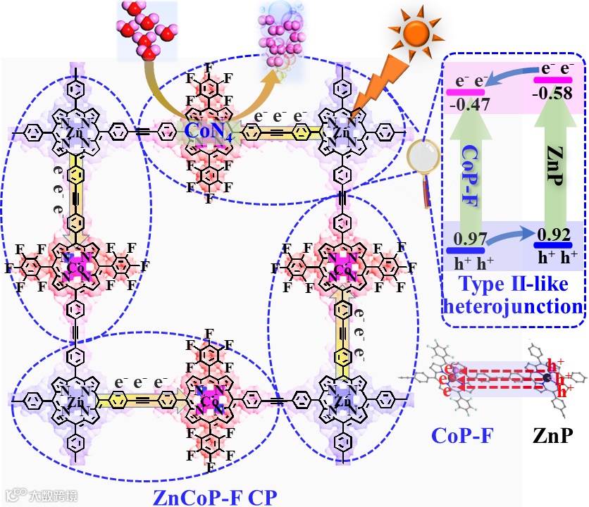 导读:该论文通过系列表征证明聚合物中不同的取代基使其内部相邻两个卟啉分子之间会形成周期性的II-型异质结,光生电子从锌卟啉核转移至钴卟啉核。