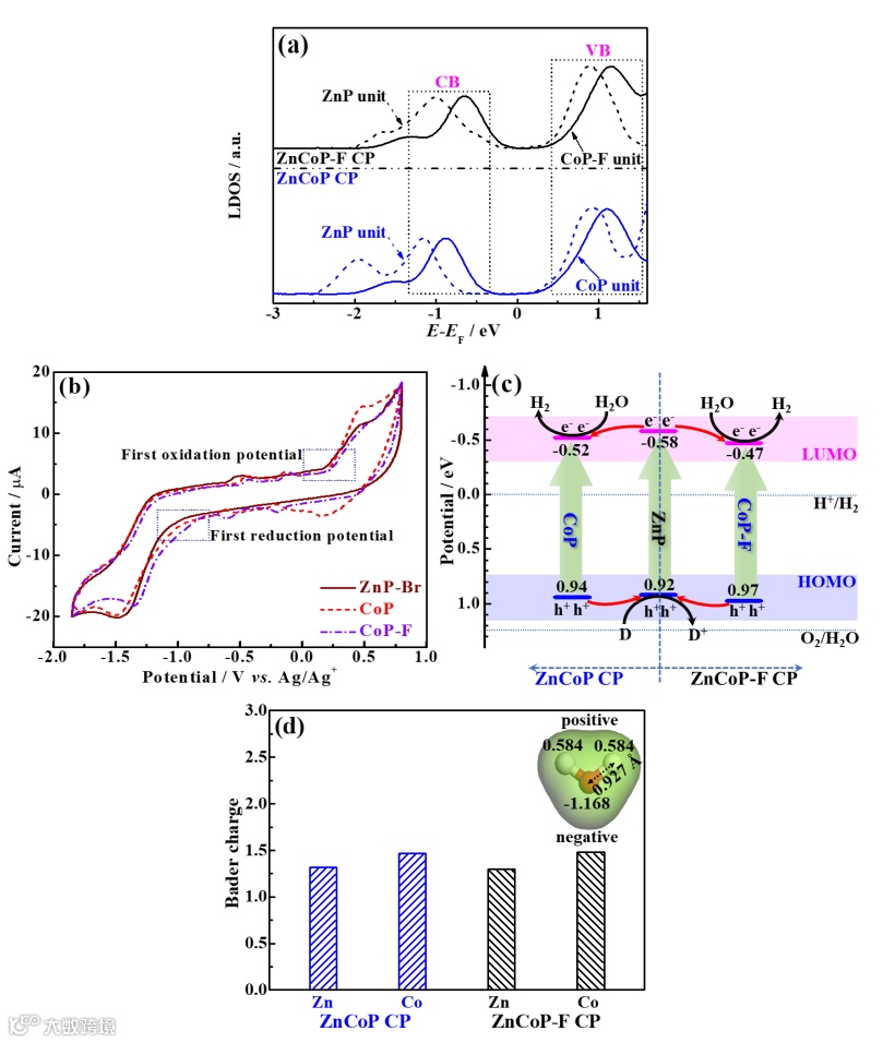 理论计算结果显示,在聚合物(ZnCoP CP和ZnCoP-F CP)中锌卟啉核的导带位置均比钴卟啉核的导带位置负,而锌卟啉核的价带均比钴卟啉核的价带正。卟啉单体(ZnP-Br、CoP、CoP-F)的电化学实验结果表明锌卟啉单体(ZnP-Br)比钴卟啉单体(CoP、CoP-F)有更低的第一还原/氧化电位,即锌卟啉核比钴卟啉拥有更低的LUMO/HOMO能级位置。