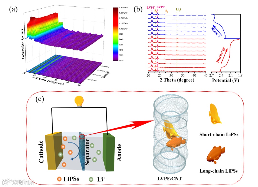 要点一:原位X射线衍射观察到锂硫电池内部的氧化还原反应,并且发现LiVPO4F/CNT电化学催化剂在充放电过程中能够保证其结构稳定性。