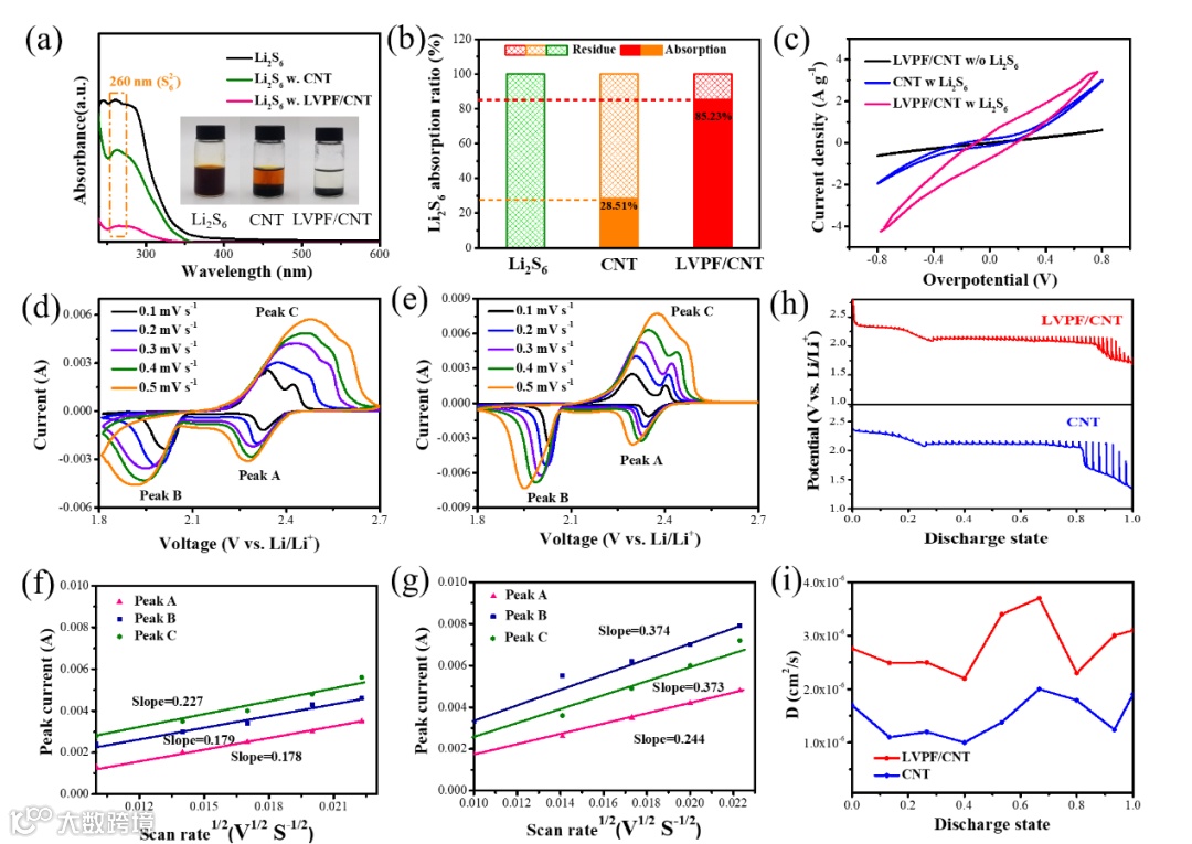 要点三:催化和吸附测试表明LiVPO4F/CNT电化学催化剂不但可以促进聚硫化物的转换,提高电化学动力学;并且可以对聚硫化物提供强有力的化学吸附,从而抑制聚硫化物的穿梭