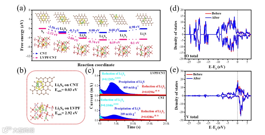 并且,LiVPO4F/CNT电化学催化剂可以将Li2S2到Li2S的转变过程的吉布斯自由能从原来的0.98 eV降低到0.1 eV,极大的加速了锂硫电池的氧化还原反应过程。值得注意的是,LiVPO4F/CNT可以提供聚硫化物的化学吸附以及优化Li2S的成核过程。