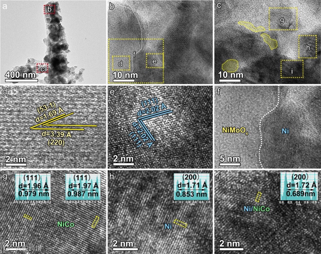 图3. Ni NCNA精细结构调查。(a)单个纳米棒复合纳米片单元。(b,d-f)纳米棒区域微结构分析。(c,g-i)复合区域微结构分析。