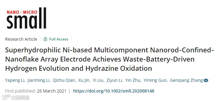 基于此,来自中国科学技术大学的章根强教授,在国际知名期刊Small上发表题为“Superhydrophilic Ni-based Multicomponent Nanorod-Confined-Nanoflake Array Electrode Achieves Waste-Battery-Driven Hydrogen Evolution and Hydrazine Oxidation”的研究文章。