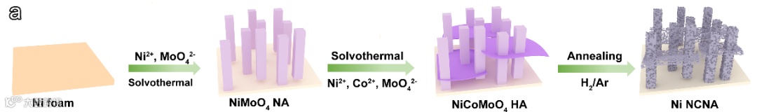 首先在泡沫镍基底上生长了NiMoO4 纳米棒阵列,随后二次水热在纳米棒上复合了纳米片,形成NiCoMoO4分级结构,最后在H2/Ar气氛中退火获得了纳米棒复合纳米片Ni基多组分阵列。