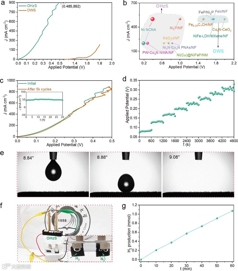 我们进一步进行了水接触角测试,如图4e所示,水滴在该复合结构表面会快速铺展,说明Ni NCNA具备超亲水表面特性,从而可促进电解质的快速接触,气泡的迅速释放和活性位点的重新暴露,满足了大电流运行需要。
