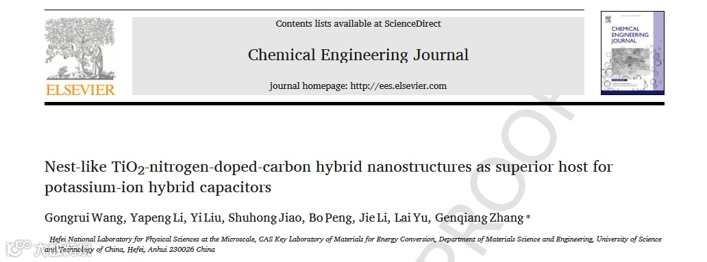 近日,中国科学技术大学的章根强教授团队,在知名期刊Chemical Engineering Journal 上发表了题为“Nest-like TiO2-Nitrogen-Doped-Carbon Hybrid Nanostructures as Superior Host for Potassium-Ion Hybrid Capacitors”的通讯文章。