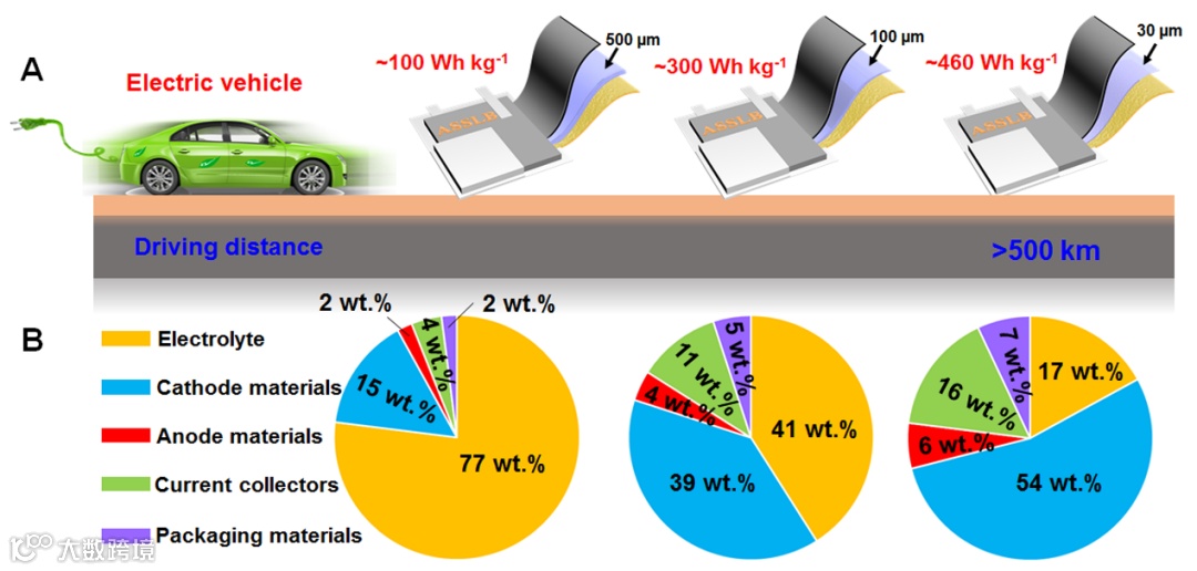 图1. 电解质厚度与固态电池组分、电池能量密度及续航里程的关系图。