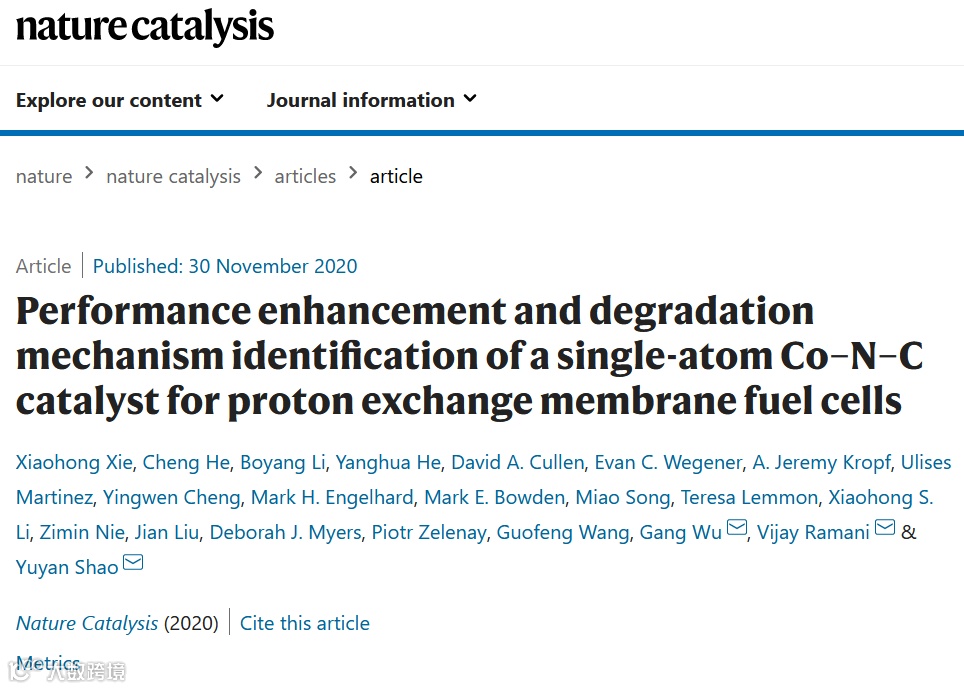 Nature catalysis:质子交换膜燃料电池单原子Co–N–C催化剂的性能增强和降解机理鉴定