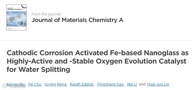 近日,来自暨南大学的林怀俊副研究员在国际知名期刊Journal of Material Chemistry A上发表题为“Cathodic Corrosion Activated Fe-based Nanoglass as Highly-Active and -Stable Oxygen Evolution Catalyst for Water Splitting”的研究工作。