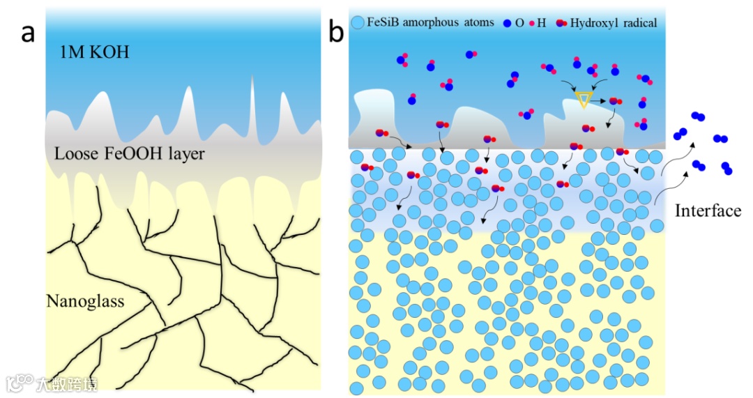 基于以上不足,研究人员提出通过对在Fe非晶合金中引入结构缺陷来实现体、表协同催化,并借助电化学腐蚀产物FeOOH来加快电荷转移效率,显著地提高OER催化活性及循环寿命。