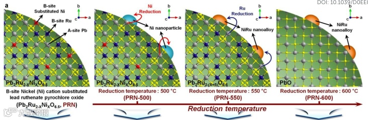 导读:该工作证明了合理设计的杂化催化剂,通过金属纳米粒子在B位镍取代的钌酸铅烧绿石氧化物上的原位脱溶过程,提高了析氧反应和析氢反应活性。