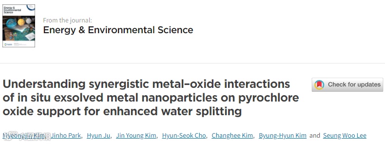 庆北大学Myeongjin Kim,韩国能源研究所平台技术实验室Byung-Hyun Kim,美国佐治亚理工学院Seung Woo Lee 教授在知名期刊Energy & Environmental Science 上发表题为“Understanding synergistic metal–oxide interactions of in situ exsolved metal nanoparticles on pyrochlore oxide support for enhanced water splitting”的研究工作。