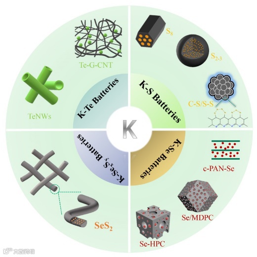接下来,分别介绍了四种储能体系:钾硫电池,钾硒电池,钾-硫硒电池, 钾碲电池, 并对其几年来在材料设计方面的进展进行了详细的介绍。