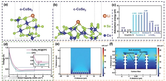 Fig. 2 DFT calculations of Li atom with (a) o-CoSe2 and (b) c-CoSe2. (c) Comparison of Ead of one Li atom adsorbed on C, graphitic N, pyrrolic N, pyridinic N, oxidised N, o-CoSe2, and c-CoSe2. (d) Voltage profiles of CoSe2–NC@CFC and CFC during initial Li deposition at 1 mA cm-2. (e) FEA of current density distribution at nanoflakes/electrolyte interface and (f) its partially enlarged figure.