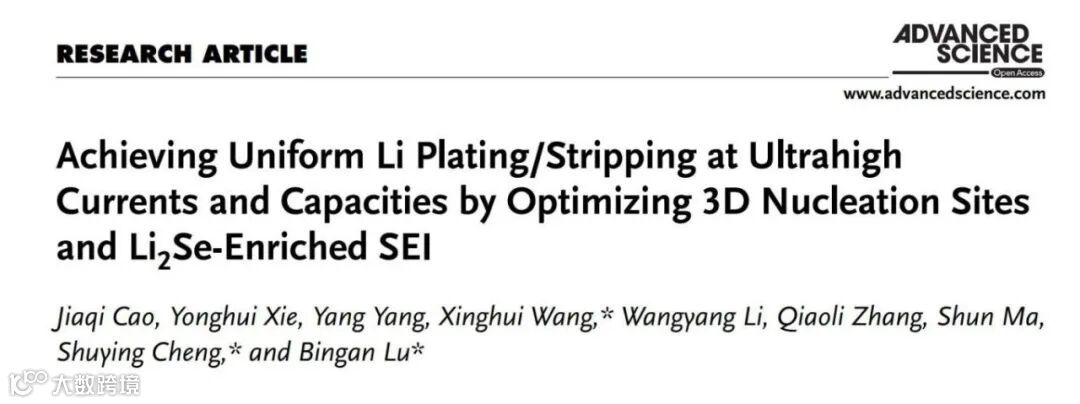 基于此,福州大学王星辉教授、程树英教授和湖南大学鲁兵安教授团队合作,硕士生曹嘉祺为第一作者,谢永辉和杨洋为共同第一作者,在国际知名期刊Advanced Science上发表题为“Achieving Uniform Li Plating/Stripping at Ultrahigh Currents and Capacities by Optimizing 3D Nucleation Sites and Li2Se-Enriched SEI”的文章。