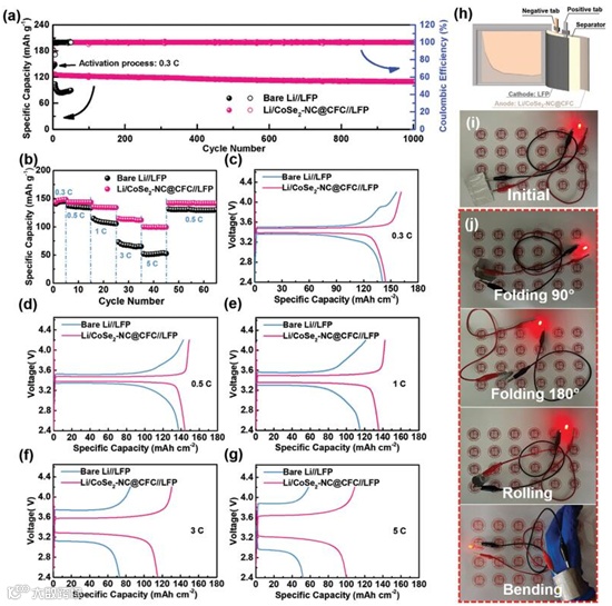 Fig. 4 Electrochemical performances of full cells. (a) Long-term cycling performance of Li//LFP and Li/CoSe2–NC@CFC//LFP cells at 2 C. (b) Rate performance and (c–g) voltage profiles of Li//LFP and Li/CoSe2–NC@CFC//LFP cells cycled from 0.3 to 5 C. (h) Schematic illustration of Li/CoSe2–NC@CFC//LFP pouch cell. (i–j) Illuminating test of Li/CoSe2–NC@CFC//LFP flexible pouch cell under various folded states.