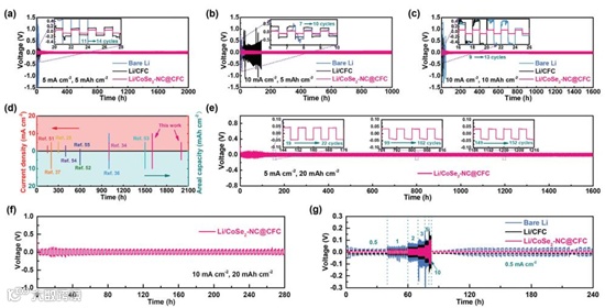 获得的 Li/CoSe2-NC@CFC 能够预储高达40 mAh cm-2的锂,且体积变化很小。特别的,Li/CoSe2-NC@CFC复合锂金属负极可以在超高电流和面积比容量(10 mA cm-2/10 mAh cm-2 和 5 mA cm-2/20 mAh cm-2)下稳定循环1600 小时,该性能优于已报道的锂金属负极。