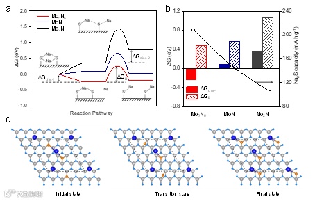 接着,同步辐射吸收谱表明不同催化剂表面Mo的电子态在充放电过程中的可逆变化有利于Na2S沉积。通过对过渡态的进一步分析,揭示了催化剂表面Mo的d带中心会显著影响Na2S成核中间体的吸附从而影响Na2S2解离能和Na2S成核反应能垒(图4)。