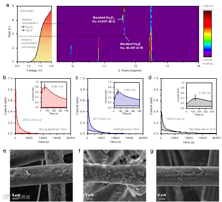 通过原位同步辐射XRD的数据,我们发现Na2S在Na2S2相出现之前生成,表明 Mo5N6表现出从 Na2S2 到 Na2S 的非常快的转化动力学,另外Na2S沉积实验也验证了与MoN和Mo2N相比,Mo5N6的加入显著增大了Na2S沉积的电流和容量。