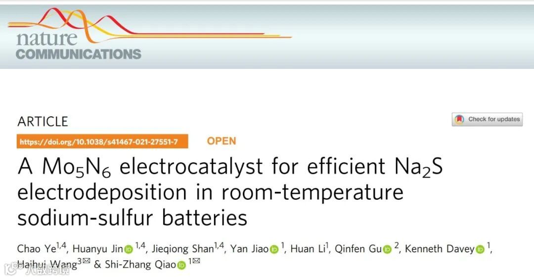 本文中,来自阿德莱德大学的乔世璋教授与清华大学的王海辉教授合作,在国际知名期刊Nat  Commun上发表题为“A Mo5N6 electrocatalyst for efficient Na2S electrodeposition in room-temperature sodium-sulfur batteries”的研究论文。该研究论文证明了电催化剂的电子结构与Na2S沉积的反应活性的关系。