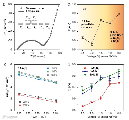 通过测硫碳电极在不同电压下电化学阻抗谱的方式来确定钠-硫电化学反应中的决速步骤,通过Arrhenius 方程的拟合,从 S8 到 Na2Sx (x = 5–8) 具体有较低的能垒(0.63 和 0.57 eV ),而继续转化生成Na2S4/Na2S3 的能垒增加至0.82 eV。
