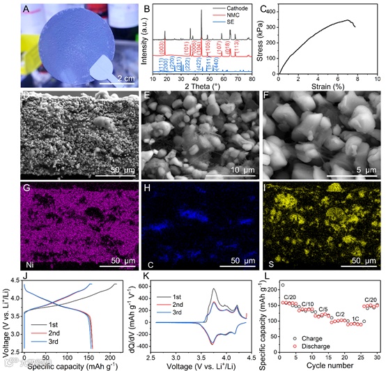 一种单晶的NMC811被选取做正极材料,其表面通过湿化学方法制备了一层Li2SiOx来稳定与硫化物电解质的界面。将正极材料与1wt.%的醚化纤维素分散在甲苯的溶液中,醚化纤维素有助于正极材料的均匀分散,然后通过抽滤得到了自支撑的正极薄膜,其厚度可以通过调整分散液体积和浓度来控制,大小可以通过调整抽滤装置来调控。得到的正极薄膜具有可加工级别的机械强度,在半电池测试中表现出优异的电化学性能。