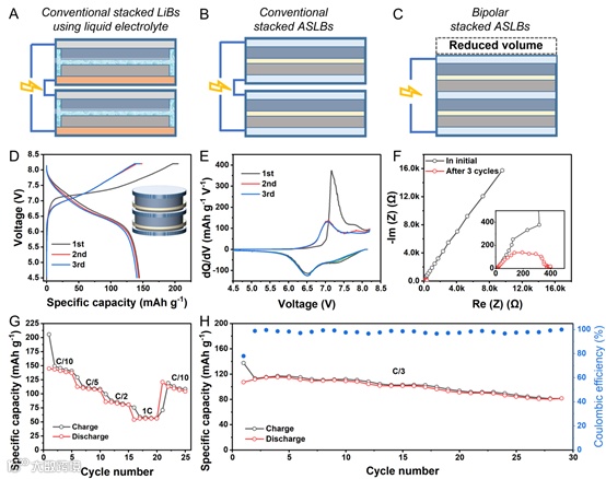 将制得的单个全电池串联叠加起来,便得到了双极全固态电池。其中相邻的电池的正极和负极分享同一个集流器。具有10µm厚度的不锈钢箔由于其在正负极的高稳定性被选做集流器。由两个电池串联的双极全固态电池得到了高达8.2 V的电压,并且稳定循环30次。