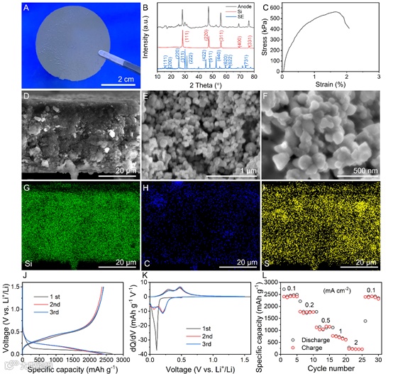 负极采用了一种基于硅纳米颗粒的复合材料。将负极材料与醚化纤维素分散在甲苯溶液中,类似的通过抽滤的方式,便得到了具有良好机械强度厚度均匀可控的负极薄膜。在半电池中,同样表现出优异的电化学性能。