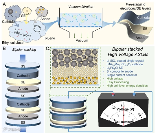 报道了一种利用醚化纤维素-甲苯的体系制备自支撑正极、负极及电解质层的方法,然后通过简单的逐层叠加的方法,得到了基于硫化物固态电解质的双极全固态电池,整个电池组具有8.2V的电压和基于整个电池(包含集流器)的高达204 Wh kg-1的能量密度,相比之下,单个电池只有189 Wh kg-1 的 能量密度,凸显了双极固态电池的优势 。