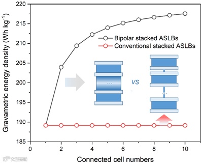 双极全固态电池的能量密度会随着堆叠电池的数量增加而增高,当前工作中双极全固态电池表现出204 Wh kg-1的电池级能量密度(包括集流器),而单个电池的能量密度则为189 Wh kg-1,当堆叠电池数量增加,双极堆叠电池的能量密度远高于普通堆叠的电池能量密度。