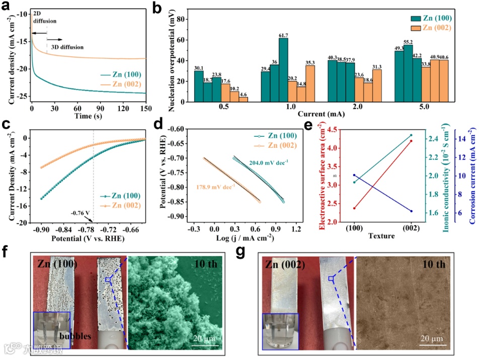 图3. 锌负极的电化学性能。a) 计时电流法;b) Zn/Zn对称电池在不同电流密度下的形核过电位;c) 线性扫描伏安法;d) 对应的Tafel曲线;e) 电活性表面积、离子电导率和腐蚀电流;循环10圈后的宏观和SEM图:f) Zn (100) 和 g) Zn (002).