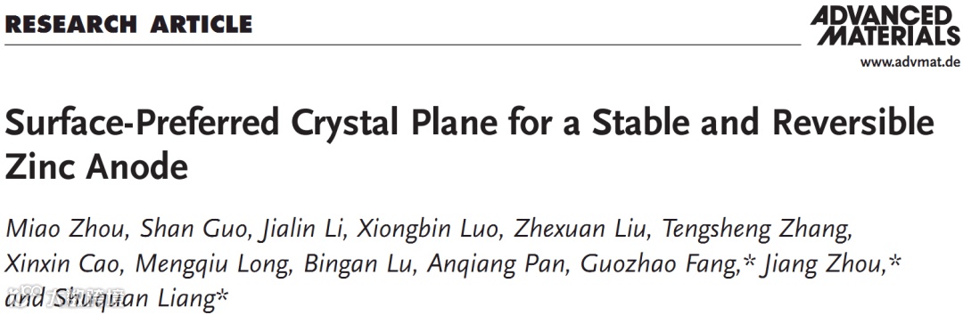 基于此,中南大学梁叔全/周江/方国赵教授等在国际顶级期刊Advanced Materials(影响因子:27.398) 上发表题为“Surface-preferred crystal plane for a stable and reversible zinc anode ”的文章。