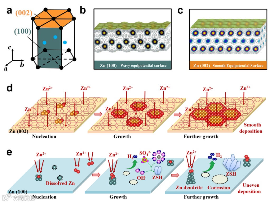 图1. 锌负极不同表面结构及其表面反应示意图。a) 金属锌的结构图;b) Zn (100)和 c) Zn (002)锌负极表面原子排布和电子等势面图;d) Zn (002)和 e) Zn (100)锌负极表面充放电过程示意图。