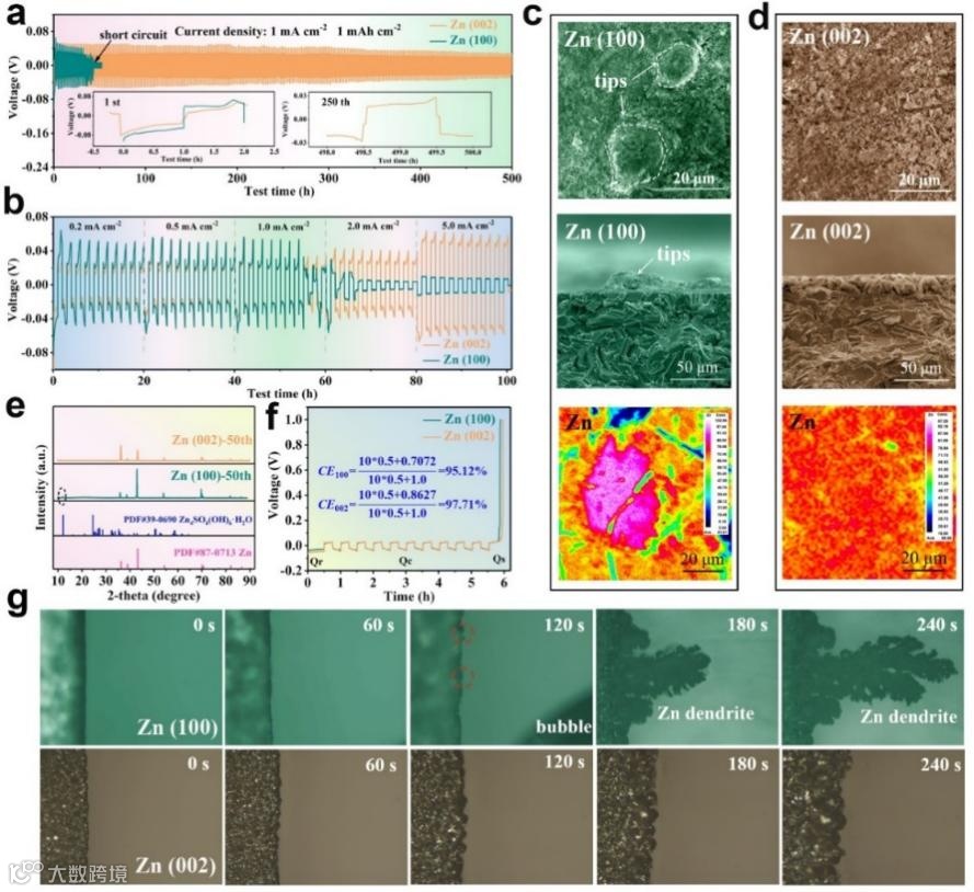 图4. 对称电池的电化学性能。a) Zn/Zn 对称电池长循环电化学性能图;b) 倍率性能图;SEM图和EPMA 面扫:c) Zn (100)和d) Zn (002). e)循环50圈后的 XRD图谱;f) Zn/Cu电池的效率图;g) 原位光学显微观察。