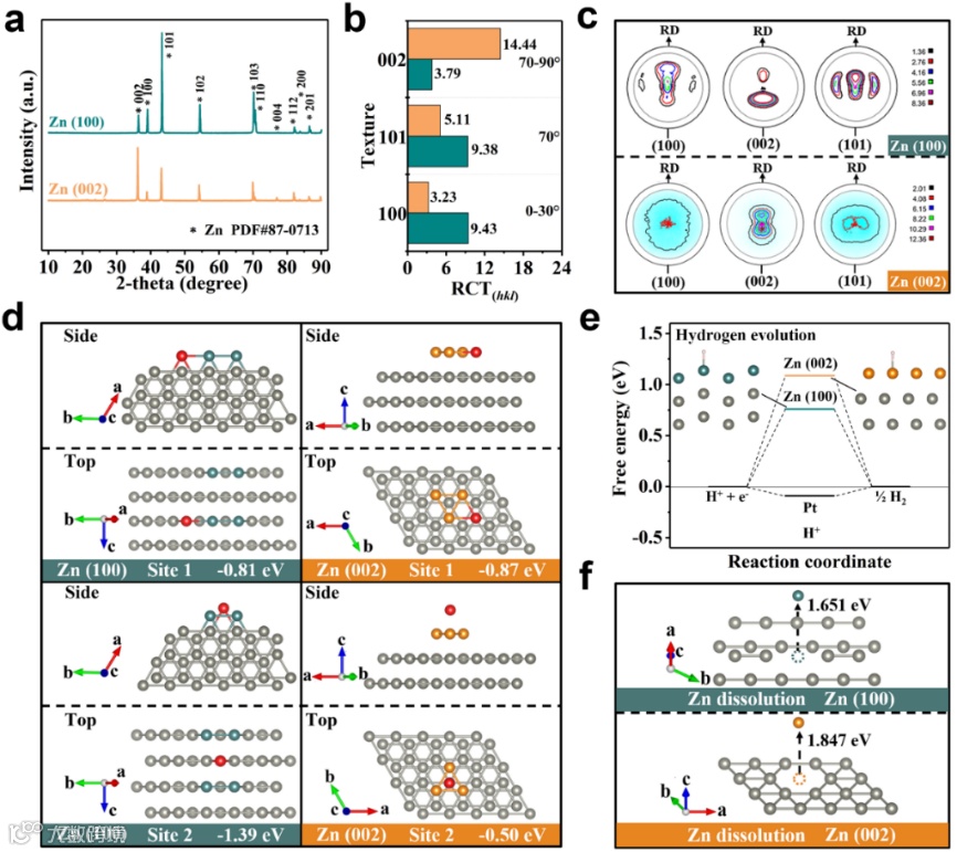 图2. 锌负极的表征与理论模拟。a) 锌负极循环前XRD图谱;b) 对应的RTC柱状图. c)锌负极 (100), (002)和 (101) 极图. d) 锌吸附在 Zn (100)和Zn (002) 负极表面不同位点的吸附能对比;e) 析氢反应的自由能图;f) 锌脱离不同锌负极表面的能量对比。