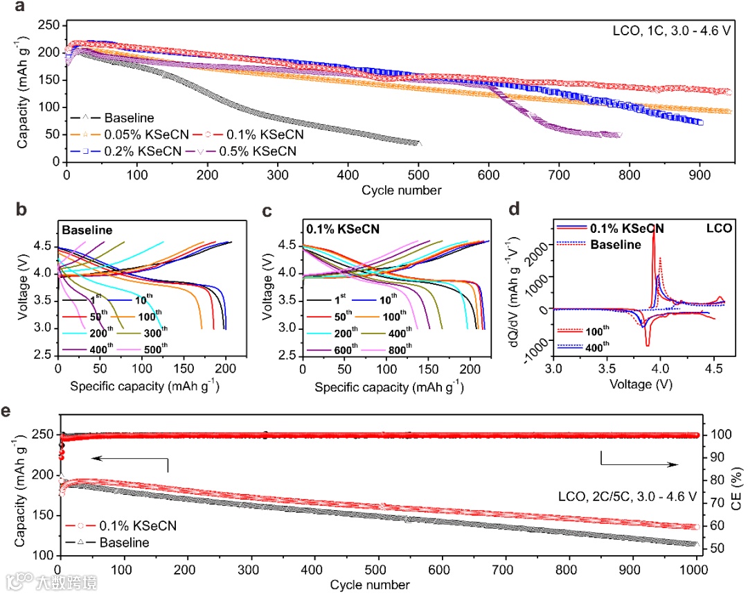 图4. Li||LCO电池在含有不同KSeCN添加量的传统酯类电解液中的循环性能,测试电压区间为3.0-4.6 V,测试倍率为1C(200 mA g-1);(b,c)Li||LCO电池在(b)传统酯类电解液和(c)含有0.1 wt% KSeCN的优化电解液中的容量-电压曲线;(d)Li||LCO电池在上述两种电解液中第100和400次循环的dQ/dV曲线;(e)采用上述两种电解液组装的Li||LCO电池在2C充电倍率和5C放电倍率下的循环性能。
