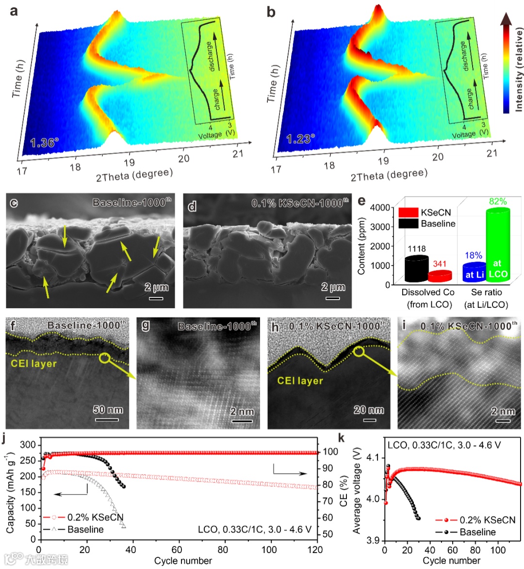 最后,文中研究了KSeCN添加剂在实用条件下(LCO正极面载量:~12 mg cm-2,即2.58 mAh cm-2;锂金属负极厚度:~21μm,即4.2 mAh cm-2;N/P比:~1.63;电解液添加量:15 μL)。如图7k,j所示,Li||LCO全电池在使用基准电解液的条件下循环20次后,容量迅速衰减。
