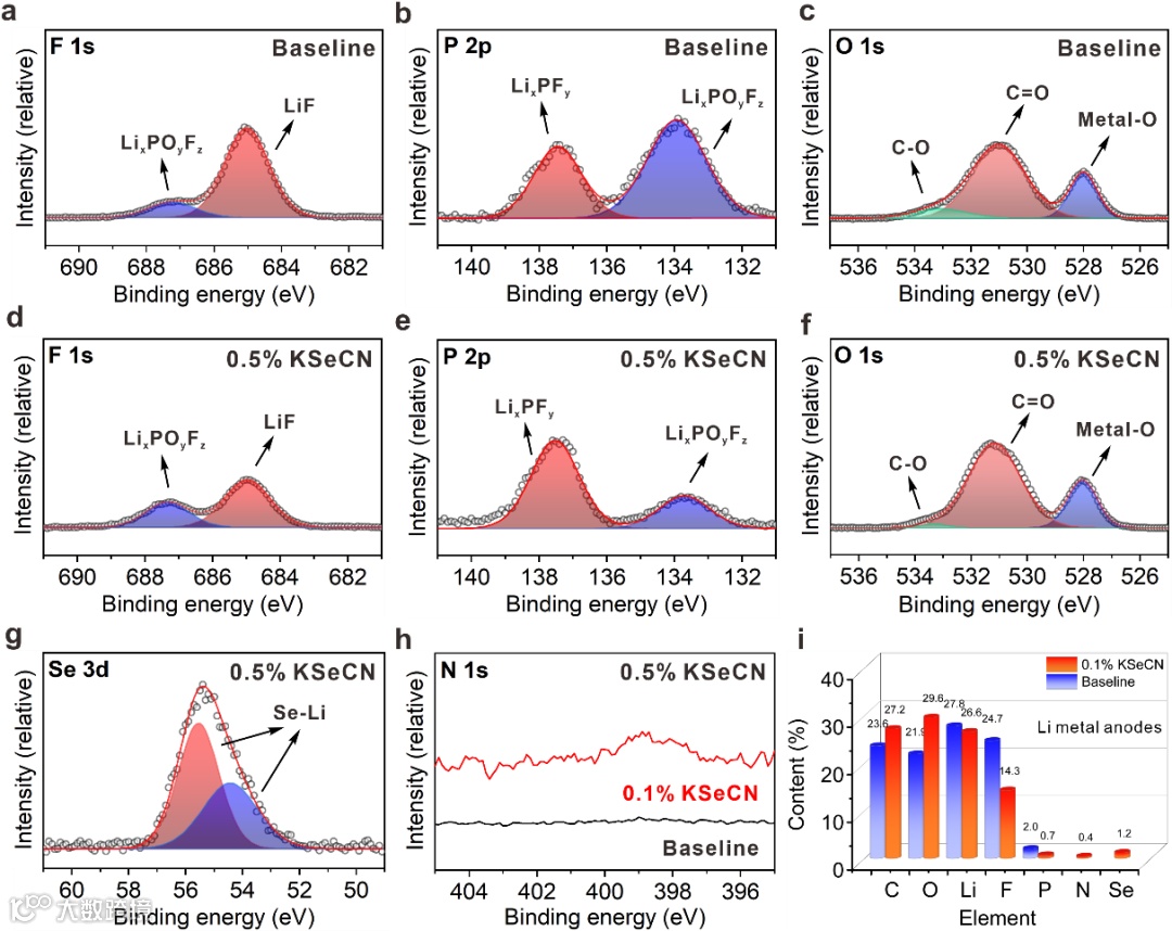 图3.(a-h)Li||Cu电池在(a-c,h)传统酯类电解液和(d-h)含0.5 wt% KSeCN的电解液中,以1 mA cm-2的电流密度在铜箔上沉积1 mAh cm-2锂金属后,拆解得到的锂负极表面的XPS谱图;(i)上述两种锂负极上形成的SEI层中的元素含量。
